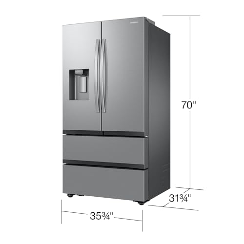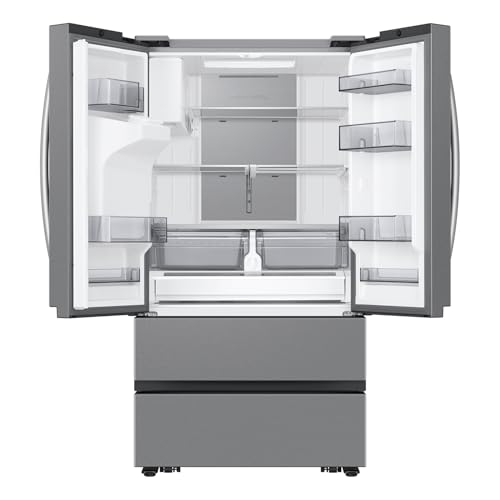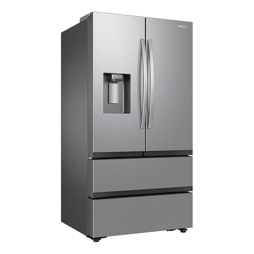 Samsung Mega Capacity 4-Door French Door Counter Depth refrigerator with 25 cu. ft. comes with four types of ice and modern design. Store more groceries, including big and bulky items. The Dual Auto Ice Maker makes two types of ice โ cubed or Ice Bites while the external dispenser offers two additional ice options, curved and crushed.