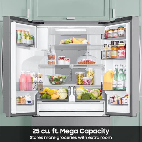 25 CU. FT. MEGA CAPACITY: Store more groceries with more room to stay organized. 25 cu. ft. mega capacity french door refrigerator gives you more space with easy access to everything you need.